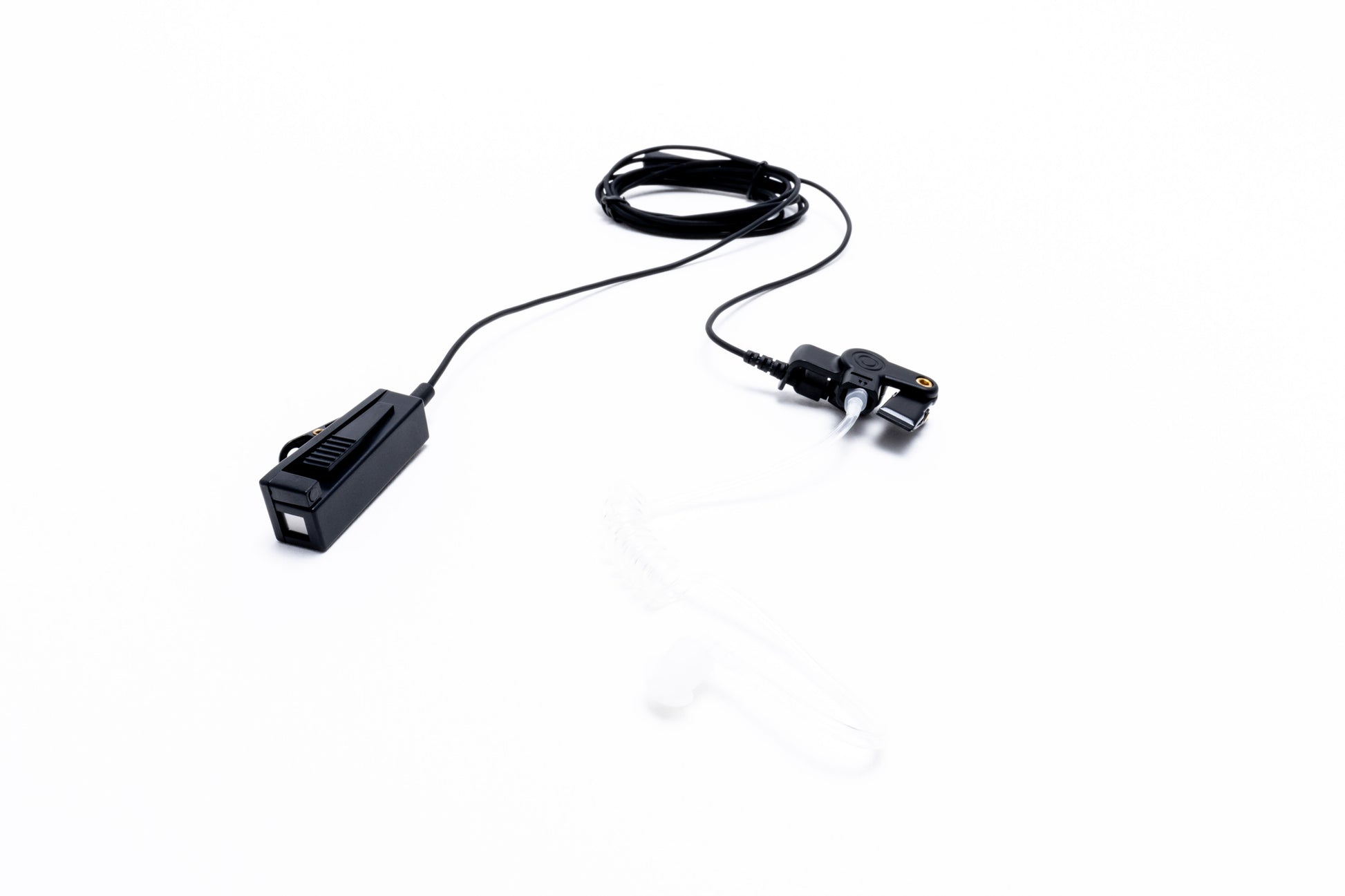 This 2-wire surveillance kit has a large Push-to-Talk (PTT) with a screened microphone and a lightweight acoustic tube earpiece. The 2-wire configuration allows for easy concealment under clothes and gives the user the option of running the push-to-talk (PTT) cable down their sleeve or wear on their shirt collar or lapel.