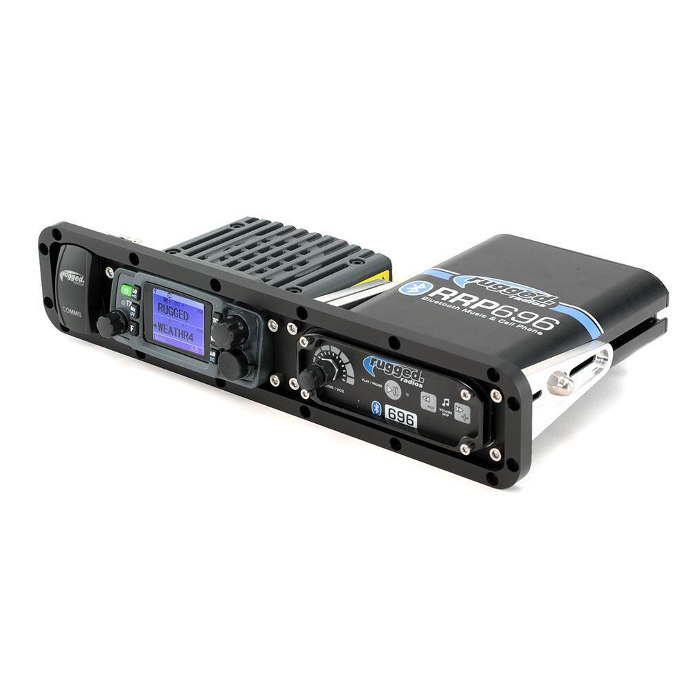 The billet alloy mount is designed for a clean installation of Rugged Radios intercoms and 25-Watt radios including the RM25 and GMR25.