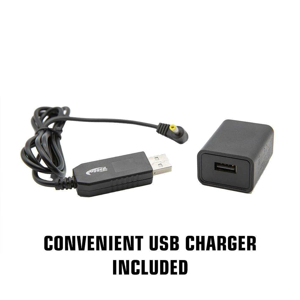- Charge-on-the-go USB cable included